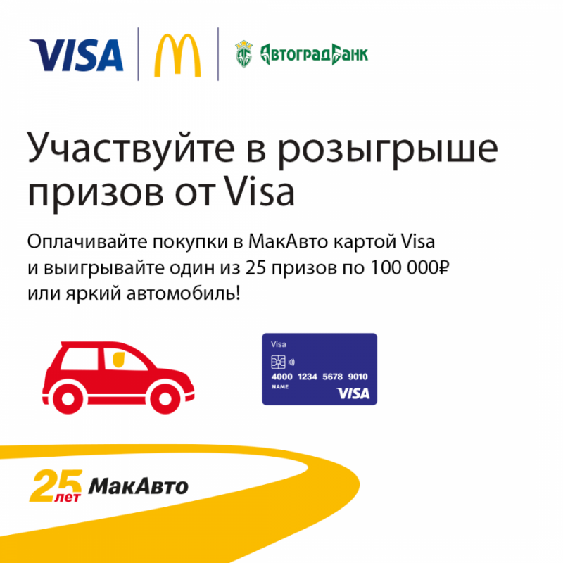 Совершайте покупки от 299 рублей в МакАвто с использованием карты Visa и участвуйте в розыгрыше яркого автомобиля для современного города и одного из 25 призов по 100 000 рублей.
