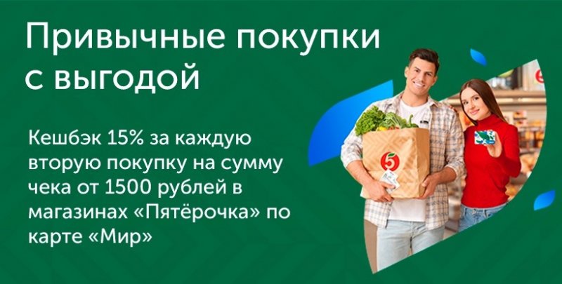 Оплачивайте покупки в магазинах «Пятерочка» картой МИР и получайте кэшбэк 15% за каждую вторую покупку от 1500 рублей.