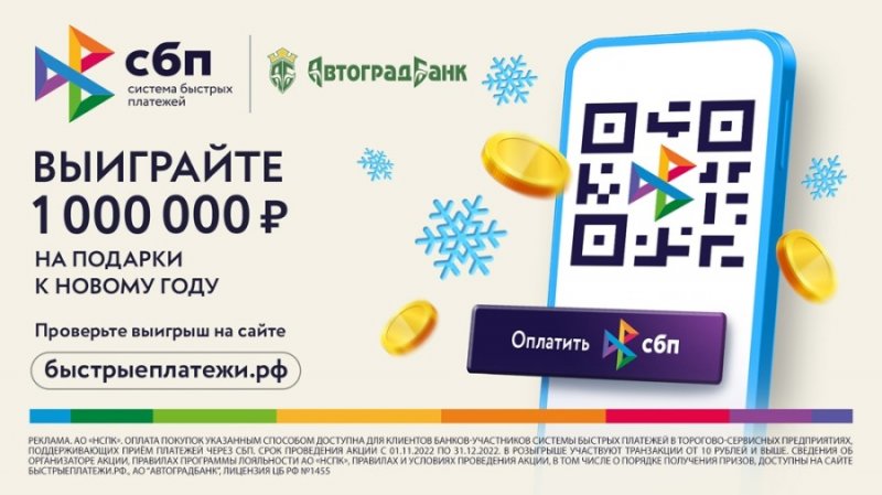 Совсем скоро начнется предновогодняя пора, когда всем хочется праздника и ощущения приближающегося чуда. Самое время подумать о подарках для себя и своих близких. Совершайте любые покупки через Систему быстрых платежей с помощью мобильного приложения Автоградбанка с 1 ноября по 31 декабря 2022 года и получите шанс выиграть: