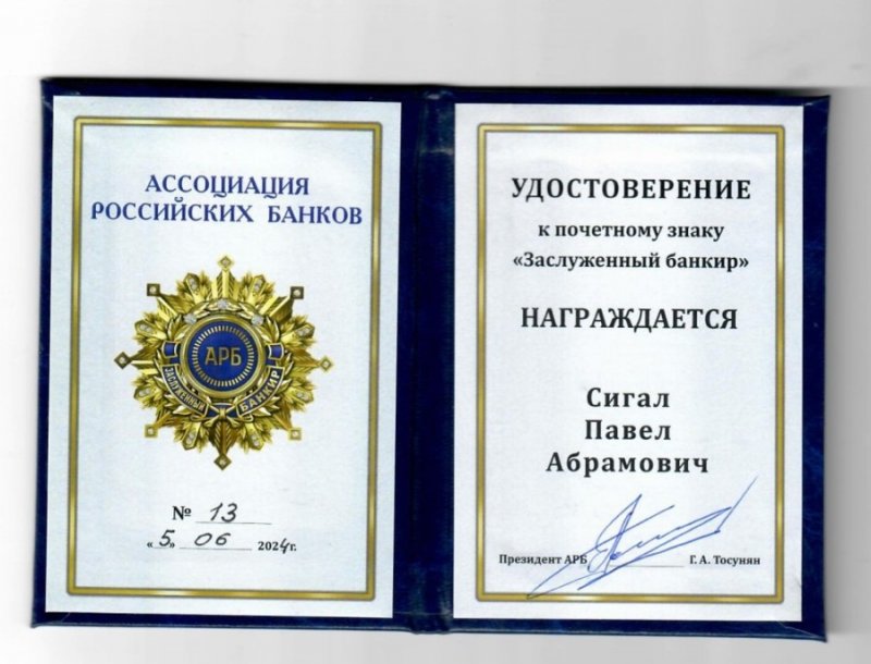Президенту Автоградбанка Павлу Сигалу за значительный вклад в развитие национальной банковской системы, за показательные успехи в банковском бизнесе, а также за деятельность, способствующую развитию банковского дела в Российской Федерации присвоено звание "Заслуженный банкир".