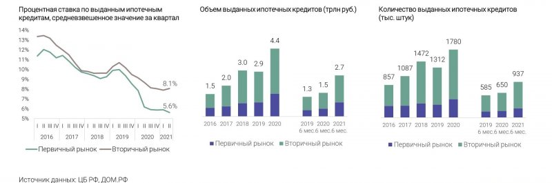 На первичном рынке в первом полугодии 2021 года высокий спрос поддерживался за счет действия льготной программы кредитования со ставкой 6,5% - при этом фактически банки предлагали еще более низкие ставки. Для жилья на вторичном рынке ипотечные ставки были низкими благодаря мягкой денежно-кредитной политике. В начале второго квартала спрос на ипотеку подстегивало ожидание роста ипотечных ставок из-за ограничения условий по программе льготного кредитования на рынке новостроек и повышения ключевой ставки ЦБ. Объем выданных ипотечных кредитов в первом полугодии 2021 г. вырос в 1,7 раза по сравнению с аналогичным периодом 2020 г., и в 2,1 раза –в сравнении с первым полугодием 2019 г. Выдачи только за 1ое полугодие 2021 года сопоставимы с выдачами ипотеки за весь 2019 год.