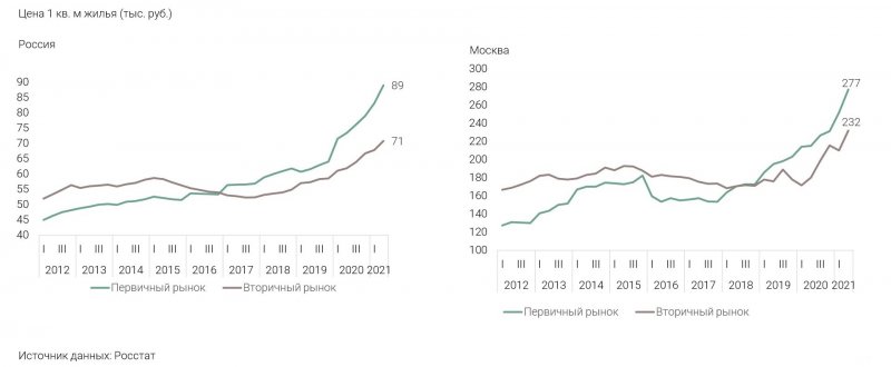 По данным Росстата, в 2021 году рост цен на рынке недвижимости продолжился почти во всех регионах России как на первичном, так и на вторичном рынке. В среднем с начала года цены выросли на 13% на первичном рынке, на 8% – на вторичном.