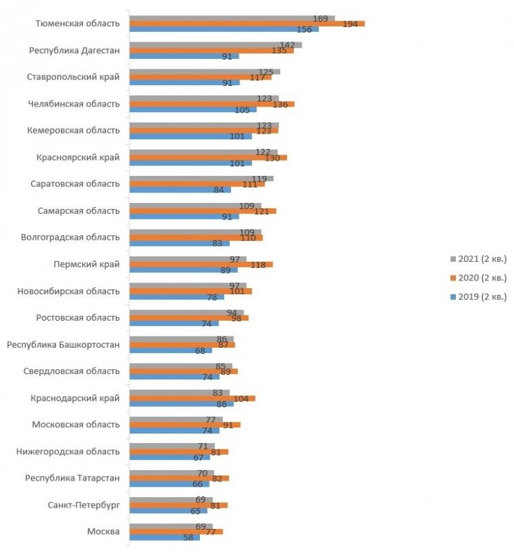 На вторичном рынке жилья доступность покупки жилья в ипотеку хоть и незначительно, но выросла во многих крупнейших регионах страны (во втором квартале 2021 г. в сравнении с таким же периодом 2020 г.). Наиболее заметное снижение доступности жилья в ипотеку во втором квартале 2021 г. произошло в Краснодарском крае и Нижегородской области (на 11%), в Кемеровской области (на 10%).
