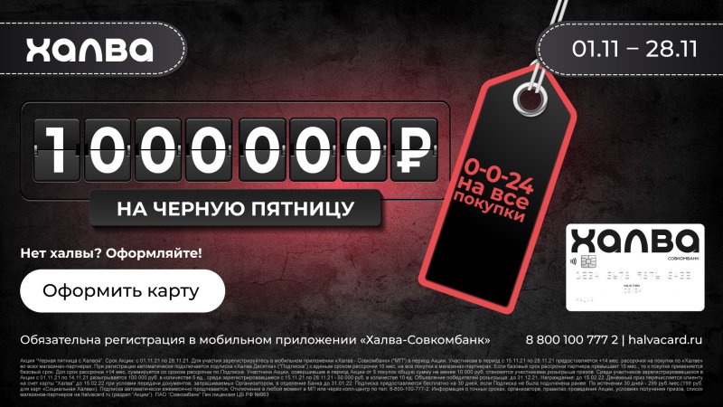 «Черная Пятница – самый популярный и ожидаемый период распродаж во всем мире. В отличие от традиционной акции, которая обычно длится не более недели в конце ноября, Черная Пятница для держателей карты «Халва» будет идти почти месяц. В этот период наши клиенты смогут делать любые покупки в длительную рассрочку у всех партнеров системы рассрочки «Халва». На сегодняшний день наша партнерская сеть насчитывает свыше 240 тысяч офлайн- и онлайн-ретейлеров», – комментирует Александр Дворский, директор национальной системы рассрочки «Халва» Совкомбанка.