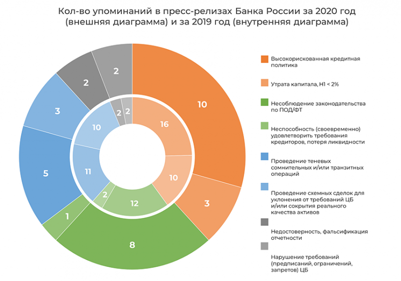 Основной причиной отзывов банковских лицензий стабильно остается высокорискованная кредитная политика, неадекватная оценка активов и залогового обеспечения, а также недостаточное резервирование. В 2020 году эта причина упоминается в десяти пресс-релизах ЦБ об отзывах банковских лицензий.