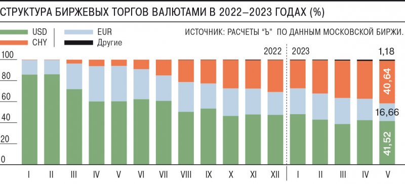 Аналитики не исключают дальнейшего уменьшения роли не только евро, но и доллара. Денис Попов не исключает снижения доли американской валюты к концу года до 25–30%. «По мере завершения выхода нерезидентов из недружественных экономик из российских проектов объемы торгов долларом могут начать снижение, повторив судьбу единой валюты на внутреннем рынке»,— отмечает Владимир Евстифеев. При этом, уточняет он, основной рост, как и прежде, будет происходить за счет юаня.