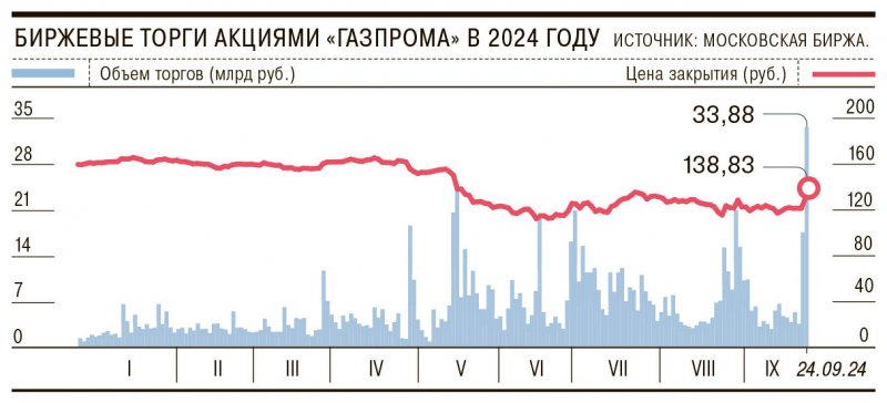Во вторник, 24 сентября, стоимость акций «Газпрома» обновила максимум с 22 мая: на основной сессии — 138,9 руб., а на вечерней — 139,9 руб. Уверенный рост котировок одной из крупнейших по капитализации российских компаний наблюдался второй день подряд. За это время они выросли почти на 15%. Рекордный за два года был и объем торгов — свыше 38,5 млрд руб.