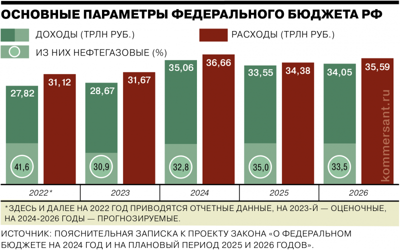 17 ноября Госдума приняла в окончательном чтении федеральный бюджет на 2024 год и плановый период 2025–2026 годов. Какие доходы ожидает правительство, каким будет курс доллара и на что пойдут самые большие суммы — в инфографике «Ъ». Фото: Дмитрий Духанин, Коммерсантъ Как ожидается, в следующем году доходы федерального бюджета вырастут на 22,3% — с 28,67 трлн до 35,06 трлн руб. Однако на 15,8% увеличатся и расходы, которые превысят поступления на 1,6 трлн руб. В 2025-м дефицит прогнозируется на уровне 0,83 трлн руб., в 2026-м — 1,54 трлн руб. Напомним, госказна ушла в минус в 2022 году, когда бюджет был исполнен с одним из рекордных дефицитов в истории — 3,3 трлн руб., а по итогам текущего она может недосчитаться еще 3 трлн руб. Нефтегазовые поступления в следующем году обеспечат 32,8% доходной части. В 2025 году их доля вырастет до 35%, затем опустится до 33,5%. При этом все три года прогнозируемый объем дополнительных нефтегазовых доходов будет составлять около 1,8 трлн руб., рассчитывают в кабинете. ВВП сохранит динамику 2023 года, когда экономика, вопреки прошлогодним прогнозам, вернулась к росту. В правительстве ожидают, что ВВП будет увеличиваться на 2,2–2,3% каждый последующий год. Согласно принятому документу, за три года объем инвестиций в номинальном выражении увеличится сразу на четверть, с 31,6 трлн до 39,6 трлн руб., и достигнет к 2026 году 19,6% ВВП. Надежды правительства на крепкий рубль в 2023 году не оправдались, поэтому бюджет на ближайший период сверстан из расчета 90,1 руб./$, а не 70,9 руб./$, о которых кабинет заявлял в прошлогоднем прогнозе. Однако негативной динамики чиновники снова не ждут. По их расчетам, к 2026 году среднегодовой курс опустится до 92,3 руб./$ в базовом сценарии и до 100,3 руб./$ — в консервативном. Инфляция, как ожидается, с 2024 года вернется к целевым показателям 4–4,5%. Напомним, по итогам 2022-го она достигла 11,9%, а в уходящем году может составить 7,5%. Бюджет текущего года верстался из прогноза 5,5%. Среднеконтрактная цена экспорта газа продолжит снижаться — с $354,4 за 1 тыс. куб. м в уходящем году до $268,8 в следующем. В 2022 году газ стоил в 2,5 раза дороже — $702,9 за 1 тыс. куб. м. Стоимость барреля российской нефти, напротив, увеличится в 2024 году на 12,4% — с $63,4 до $71,3. По мере трансформации мирового энергетического рынка правительство ожидает сохранения сырьевых котировок в диапазоне $70 за баррель. Добыча нефти в ближайшие три года планируется почти неизменной — на уровне 530 млн тонн, а вот добыча газа должна вырасти на 10,2% — с 642 млрд куб. м в уходящем году до 707,5 млрд куб. м в 2026-м. В перспективе трех лет правительство ожидает постепенного восстановления экспорта — с $475 млрд до $501 млрд. В этом году он сократится — предварительно на 22,3%. Также должен вырасти и импорт — с $303 млрд до $322 млрд. В структуре расходов крупнейшей статьей в 2024 году станет национальная оборона, на которую придется 29,4% всех трат. По сравнению с прошлогодним прогнозом ее доля выросла почти в два раза ( 13,2 п. п.), а в номинальном выражении — сразу на 132%, с 4,64 трлн до 10,78 трлн руб. В сравнении с бюджетом-2023 оборонные расходы увеличатся на 68,2%. Доля расходов на соцполитику — традиционно самую затратную графу казны — сократилась по сравнению с прогнозом годичной давности на 4,4 п. п.— до 21,1%, однако в сравнении с бюджетом текущего года увеличится на 19,1%. В денежном выражении меньше станут траты только на физкультуру и спорт (–5,5%), 
