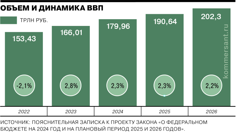 ВВП сохранит динамику 2023 года, когда экономика, вопреки прошлогодним прогнозам, вернулась к росту. В правительстве ожидают, что ВВП будет увеличиваться на 2,2–2,3% каждый последующий год.