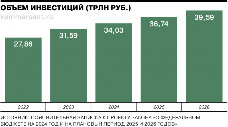 Согласно принятому документу, за три года объем инвестиций в номинальном выражении увеличится сразу на четверть, с 31,6 трлн до 39,6 трлн руб., и достигнет к 2026 году 19,6% ВВП.