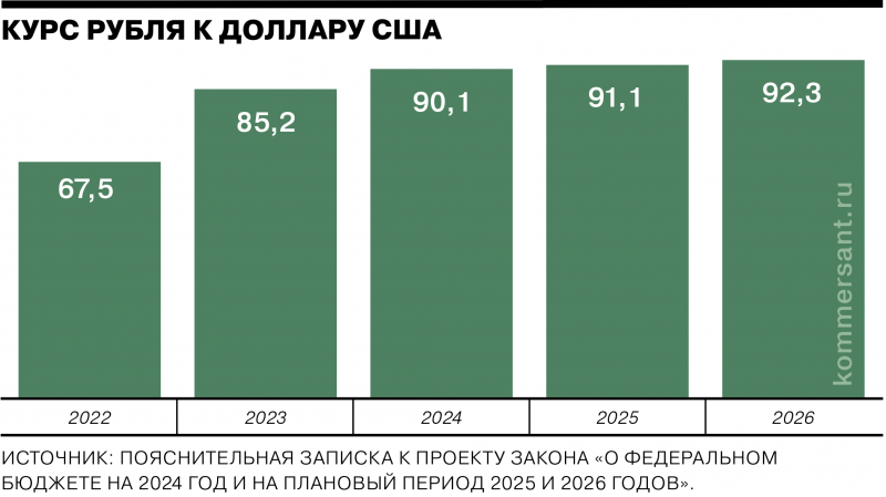 Надежды правительства на крепкий рубль в 2023 году не оправдались, поэтому бюджет на ближайший период сверстан из расчета 90,1 руб./$, а не 70,9 руб./$, о которых кабинет заявлял в прошлогоднем прогнозе. Однако негативной динамики чиновники снова не ждут. По их расчетам, к 2026 году среднегодовой курс опустится до 92,3 руб./$ в базовом сценарии и до 100,3 руб./$ — в консервативном.