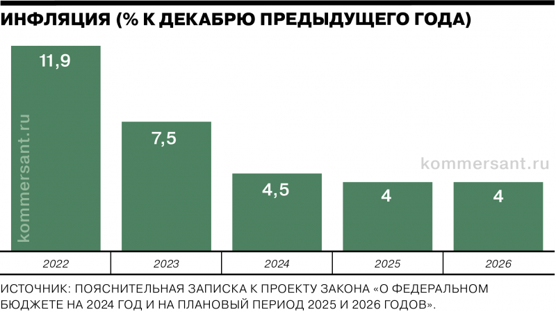 Инфляция, как ожидается, с 2024 года вернется к целевым показателям 4–4,5%. Напомним, по итогам 2022-го она достигла 11,9%, а в уходящем году может составить 7,5%. Бюджет текущего года верстался из прогноза 5,5%.