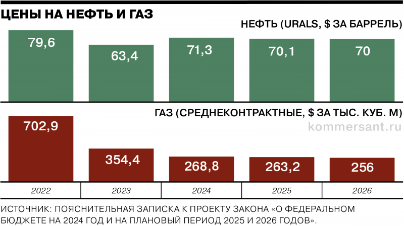 Среднеконтрактная цена экспорта газа продолжит снижаться — с $354,4 за 1 тыс. куб. м в уходящем году до $268,8 в следующем. В 2022 году газ стоил в 2,5 раза дороже — $702,9 за 1 тыс. куб. м. Стоимость барреля российской нефти, напротив, увеличится в 2024 году на 12,4% — с $63,4 до $71,3. По мере трансформации мирового энергетического рынка правительство ожидает сохранения сырьевых котировок в диапазоне $70 за баррель.