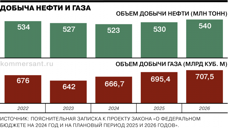 Добыча нефти в ближайшие три года планируется почти неизменной — на уровне 530 млн тонн, а вот добыча газа должна вырасти на 10,2% — с 642 млрд куб. м в уходящем году до 707,5 млрд куб. м в 2026-м.