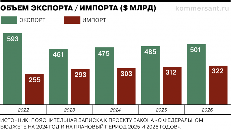 В перспективе трех лет правительство ожидает постепенного восстановления экспорта — с $475 млрд до $501 млрд. В этом году он сократится — предварительно на 22,3%. Также должен вырасти и импорт — с $303 млрд до $322 млрд.