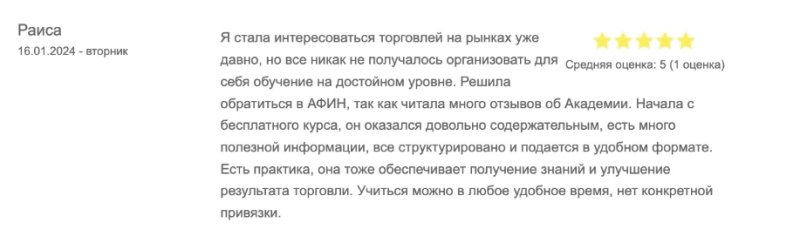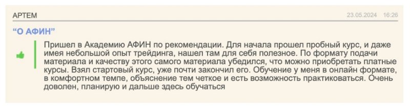 Мы решили узнать, какие впечатления у студентов, поэтому искали актуальные отзывы об опыте прохождения бесплатного обучения в АФИН. Так, в первом комментарии автор называет курс содержательным.