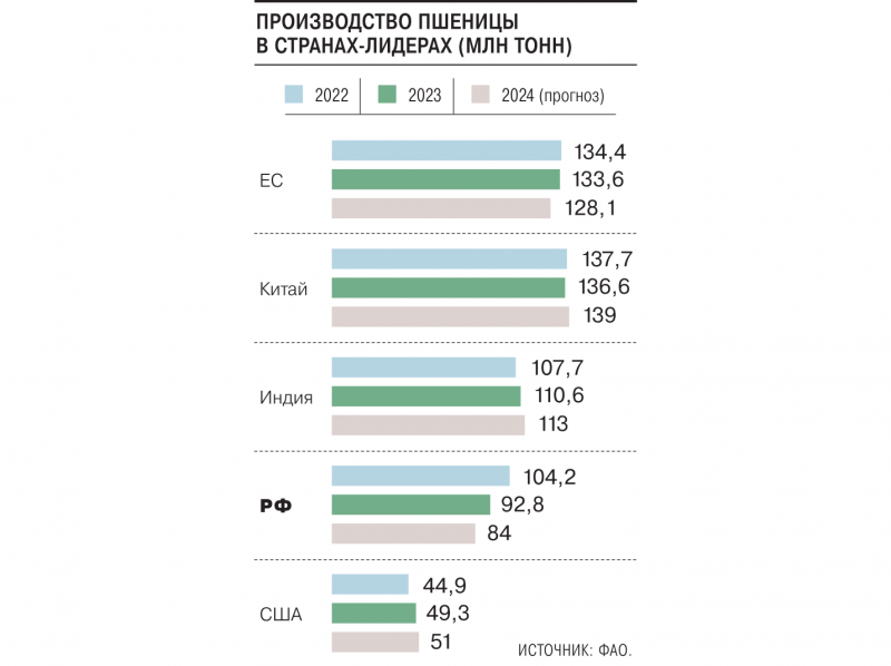 Мировое производство пшеницы в 2024 году составит 789,1 млн тонн, прогнозирует Продовольственная и сельскохозяйственная организация (ФАО) ООН в новом докладе о рынке зерна. Таким образом, объем сбора пшеницы может оказаться чуть выше прошлогоднего (788,1 млн тонн). В последние несколько месяцев ожидалось, что показатель в этом году снизится. Рост производства в 2024-м прогнозируется в том числе для таких стран-лидеров по сбору пшеницы, как Китай (139 млн тонн в 2024 году после 136,6 млн в 2023-м), Индия (113 млн после 110,6 млн тонн) и США (51 млн после 49,3 млн тонн). У остальных ключевых производителей урожай пшеницы ожидается хуже прошлогоднего. Так, в Евросоюзе он составит 128 млн тонн, что на 5% ниже среднего показателя за последние три года. Главные причины — засуха на юге Европы и рекордные осадки на севере. В 2023-м в странах ЕС было собрано 133,6 млн тонн пшеницы.