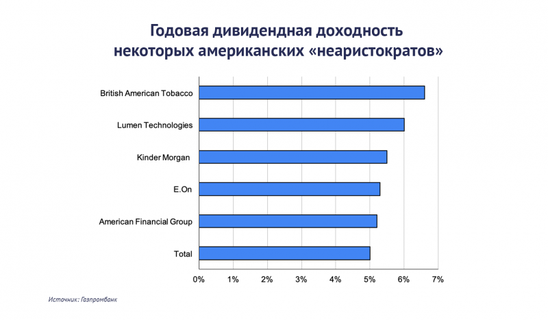 Илья Фролов составил свой топ американских «неаристократов» с высокой доходностью дивидендов — от 5% до 6,6%. В нем фигурируют Lumen Technologies, Kinder Morgan, E.On, American Financial Group и Total.