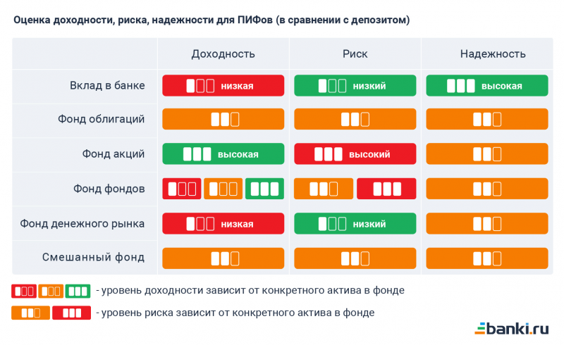 - ПИФы — хороший переходный вариант для банковских вкладчиков, которые ищут более доходные варианты для инвестиций, но не готовы покупать ценные бумаги самостоятельно. Отдавая деньги в управление профессионалам, инвестор по-прежнему несет рыночные риски.