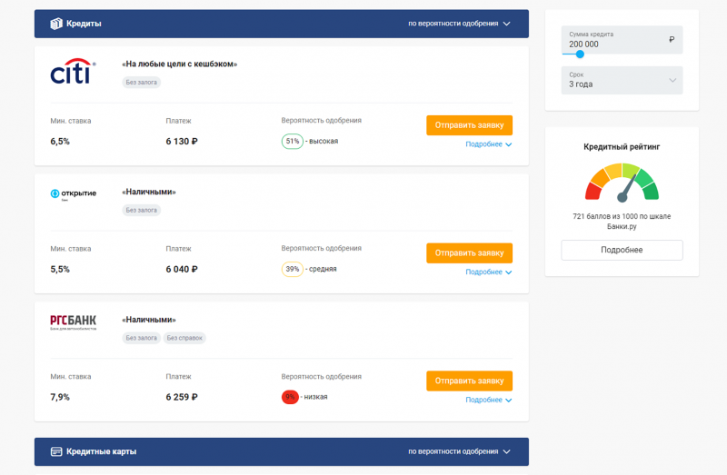 Сразу же сформируется список с условиями от нескольких банков. Останется только выбрать, какой из вариантов подходит больше всего, и отправить заявку на рассмотрение.