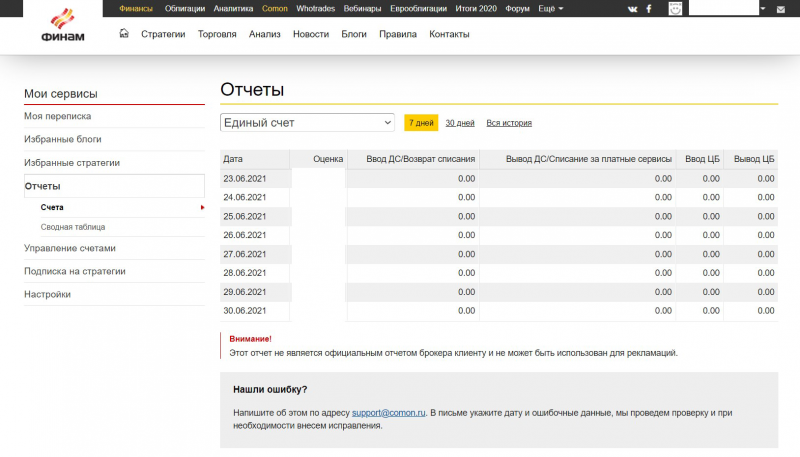 В личном кабинете я пользуюсь в основном разделом «Отчеты», где Comon каждый день подводит итоги и показывает стоимость портфеля на конец дня. В целом акции с конца апреля и до середины июня стабильно росли, но в ходе недели с 23 по 30 июня 2021 года индекс MOEX сильно упал. В итоге к концу полугодия я пришел к тому, с чего начал: стоимость портфеля соответствовала той оценке, которая была на момент изначального вложения средств. Конечно, срок в два с половиной месяца является слишком коротким для составления мнения: я собираюсь держать деньги в течение как минимум года.