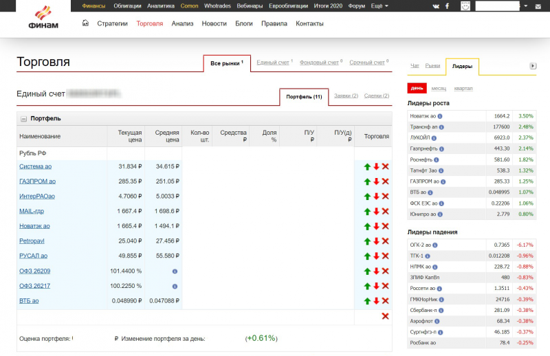 Рисунок 1. Личный кабинет пользователя Finam Comon