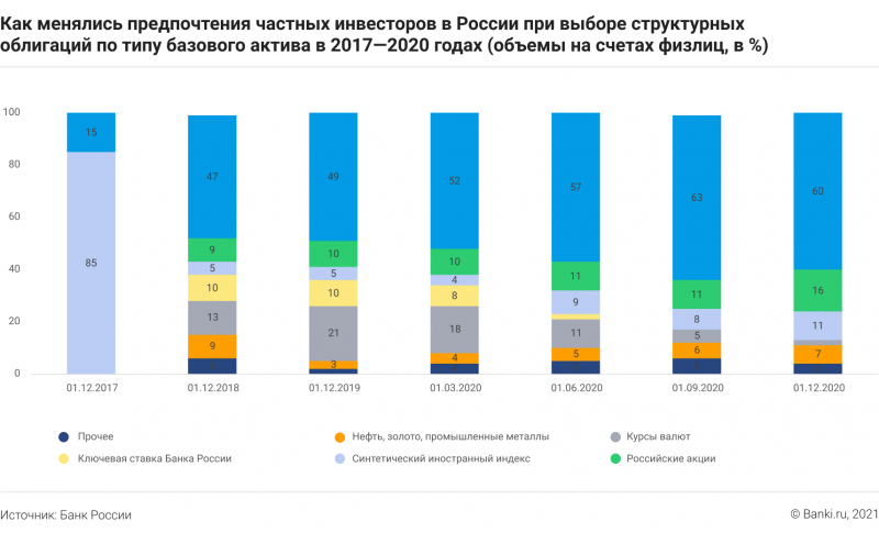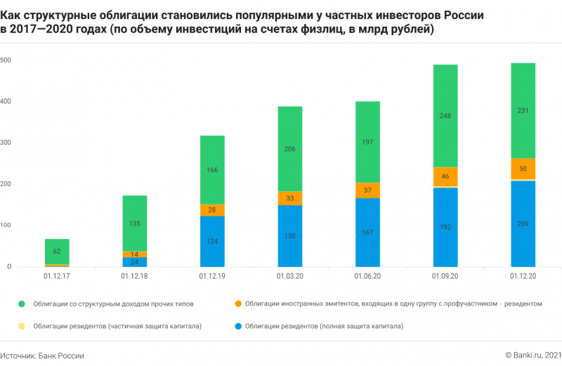 Стабильный интерес проявлялся к структурным продуктам на основе акций и валют. По информации НАУФОР, в 2020 году россияне инвестировали на фондовом рынке до 6 трлн рублей, из них в структурные рублевые и валютные облигации — 4,6% и 5,9% общей суммы соответственно. Зампред «БКС Мир инвестиции» по инвестиционному и страховому бизнесу Эдвард Голосов оценивал на декабрь 2020 года, что рынок структурных продуктов для неквалифицированных инвесторов состоял на 60—65% из облигации со структурным доходом и полнои защитои капитала, которые выпустили крупные российские банки — СберБанк, ВТБ и «Открытие».