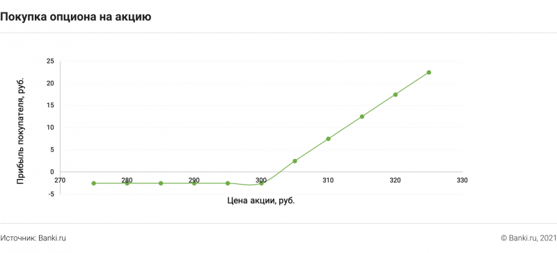 Нюанс, о котором в тесте не упоминается, но который важно иметь в виду: за приобретение опциона покупатель всегда платит премию продавцу. Это невозвратная сумма, поэтому покупатель может все-таки оказаться в убытке на размер премии, если цена так и не выросла. А также его прибыль при росте акции выше фиксированного уровня будет всегда меньше на размер той же самой премии. В нашем примере мы взяли ее в размере 2,5 рубля с контракта.