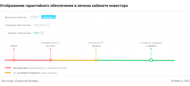 На иллюстрации показан пример того, как это может быть реализовано в личном кабинете инвестора. Есть условная «зеленая» зона, когда денег на счете хватает на обычные отклонения фьючерса. Есть «желтая», где брокер присылает уведомление с требованием пополнить счет. И есть «красная», где сделку клиента закрывают досрочно, фиксируя убыток. Если брокер этого не сделает, ему придется покрывать прибыль продавца из своих средств.