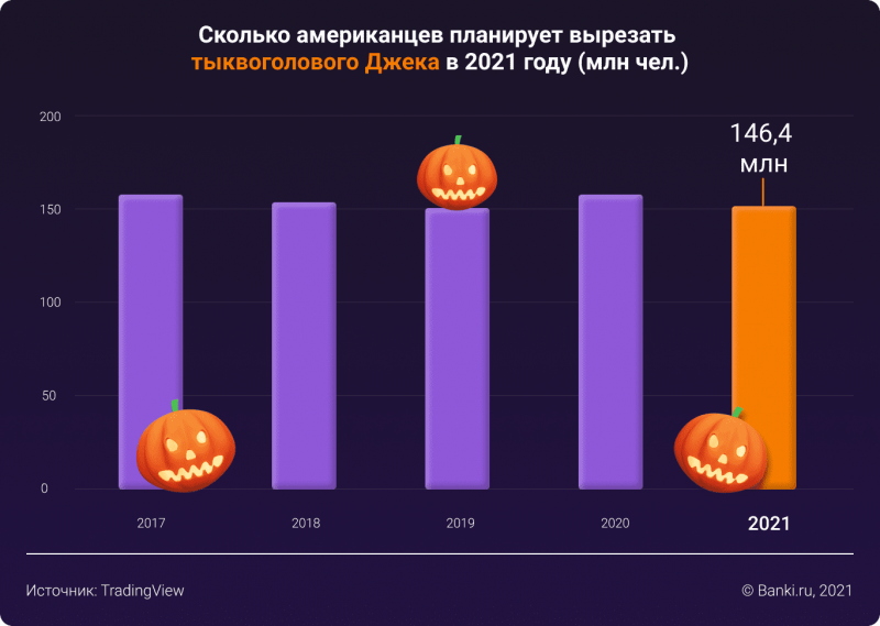 Ежегодные опросы в США показывают, что стабильно около 150 млн человек делают фонари в форме головы (у нее, кстати, есть имя — Джек). Это чуть меньше половины населения страны. Чтобы досталось всем желающим, фермеры в южных штатах ежегодно собирают около 700 млн тонн тыквы в год, или 14 кило на семью.