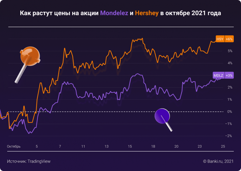В итоге продажи кондитерских изделий в США на Хеллоуин резко вырастают. Две самые крупные американские шоколадные корпорации — Mondelez и Hershey. Они владеют большинством самых популярных сладких брендов, и, как видим, для цен на их акции октябрь в этом году тоже стал благоприятным месяцем.