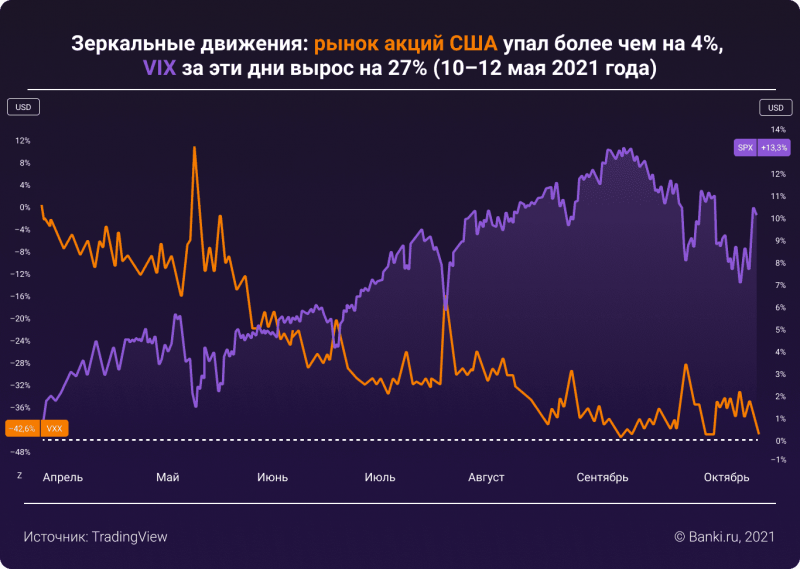 Индекс страха, он же индекс волатильности с тикером VIX, торгуется на Чикагской бирже опционов, где его высчитывают через изменение цен на другие производные инструменты. Его главная особенность — в том, что он движется в противоположную сторону по отношению к S&P 500, главному индексу акций США.
