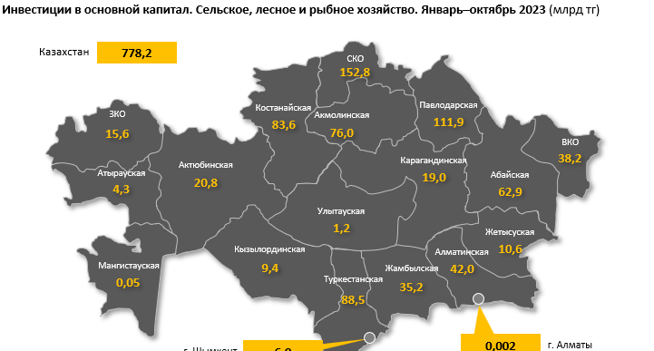 Большая часть инвестиций пришлась на растениеводство и животноводство, охоту и предоставление услуг в этих областях: 756,8 млрд тенге. Инвестиции в рыболовство и аквакультуру составили 18,5 млрд тенге, в лесоводство и лесозаготовки — 2,9 млрд тенге.