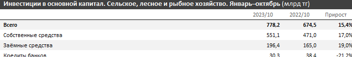 За январь–октябрь текущего года инвестиции в основной капитал в сфере сельского, лесного и рыбного хозяйства достигли 778,2 млрд тенге, что на 15,4% больше, чем годом ранее. Реальный рост с учетом инфляции составил 8,7%, подсчитали в finprom.kz.