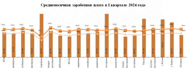 В региональном разрезе наибольший рост среднемесячной номинальной заработной платы в первом квартале 2024 года по сравнению с соответствующим кварталом 2023 года сложился в Западно-Казахстанской области – на 18,2%, в городе Алматы – на 16,4%, в Актюбинской области – на 16,1%, в Павлодарской области – на 15,9%.