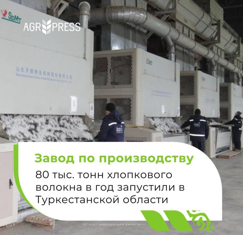 «Завод ТОО «ZHANASSYL» мощностью 80 тыс. тонн хлопкового волокна в год сдан в эксплуатацию 3 декабря. При предприятии действуют 13 хлопкоприемных пунктов в Мактааральском и Жетысайском районах. С начала уборочной кампании принято более 41 тыс. тонн хлопка. Завод перерабатывает 600 тонн хлопка-сырца в сутки и производит 180 тонн высококачественного хлопкового волокна, хлопкового линта и других продуктов», - проинформировали в МСХ.